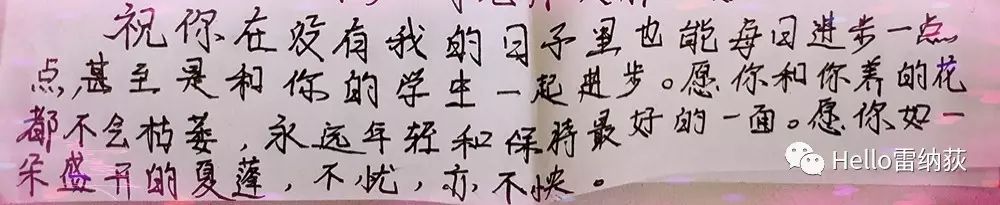 祝你在没有我的日子里也能每日进步一点点甚至是和你的学生一起进步。愿你和你养的花都不会枯萎,永远年轻和保持最好的一面。愿你如一朵盛开的夏莲,不忧,亦不怏。