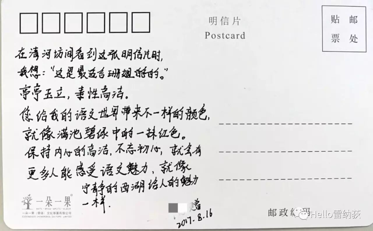 他拿暑假去乌镇旅行时自己拍摄的一沓明信片来送给我。我说,没有留言的明信片卢老师不收哦。