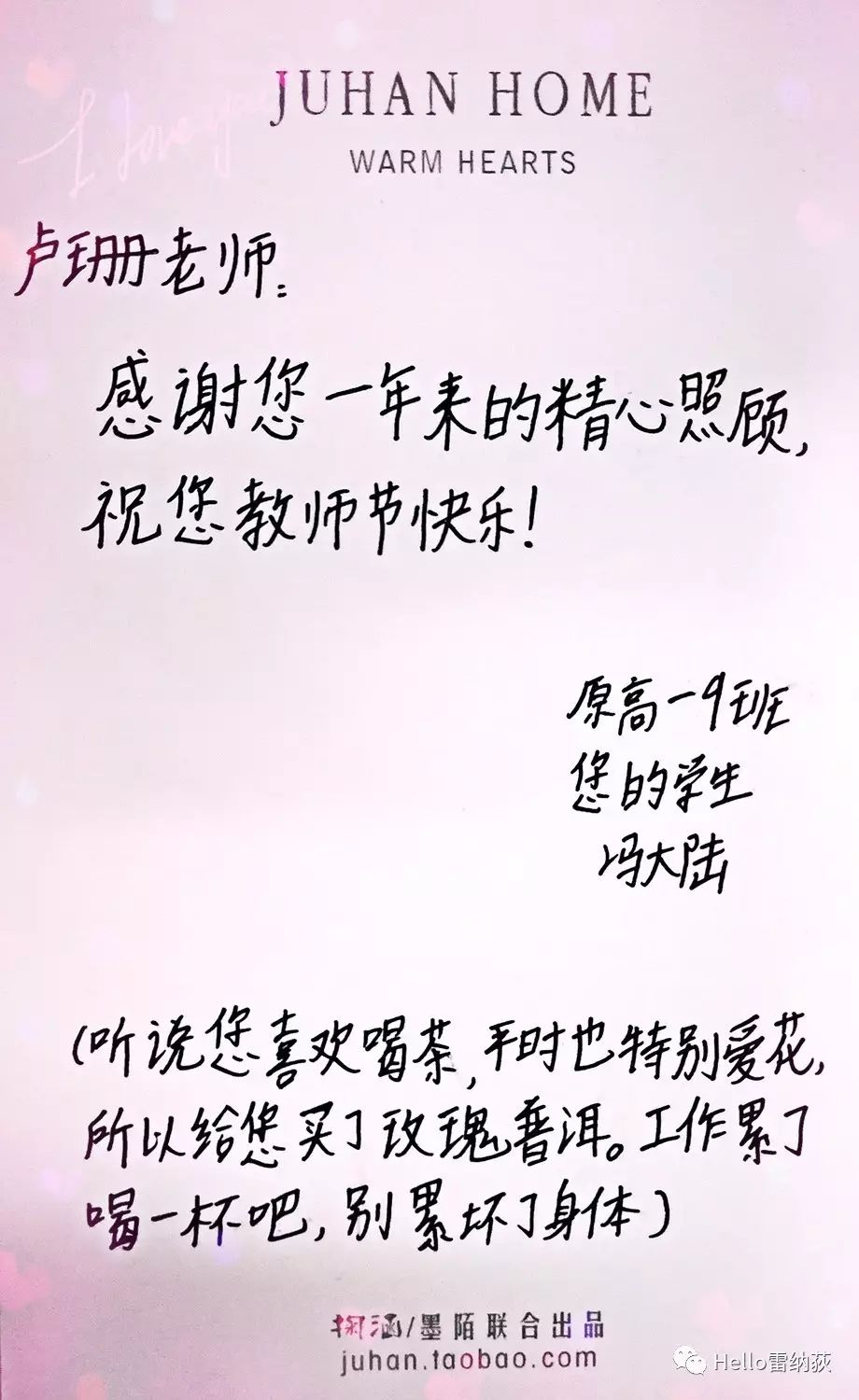 一张张细细翻阅,一字字慢慢品读,禁不住湿了眼眶。那一刻,感觉自己再也不用羡慕小汤了。虽然没有收到已毕业的学子们发回的暖心长信息,可卢老师还有身边的他们惦记着呀!