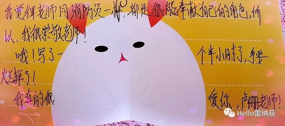 感谢这一场及时的“礼物雨”,它们给我注入了更多前行的信心和勇气。这让我想起了十年前刚开始参加工作时的景象。或许,这是一个很好的开始,是卢老师教书生涯下一个十年的美好开端。虽然失落与幸福仅仅发生在短短一天之间,然而,我并没有觉得先前的反省白费,也不认为之前的认识应当勾销。或许,正是那一次次自觉或不自觉的反省,让卢老师收获了今天来之不易的小幸福。 感谢众弟子的深情厚意。谢谢韦天宇从国外带回的护手霜,谢谢黄瑞的护颈枕,梁越的小塑像,谢谢冯大陆的普洱花茶,黄雨欣的甜美饼干;谢谢赵思源的书签,李沛伦的祝福;谢谢康婷的糕点,诗婷的娃娃,韵雯的花花;谢谢史康远花费了三天玩耍时间,给卢老师精心制作的手工美少女。谢谢去年9班、11班,今年11班、7班以及前十年所有学子给予卢老师的明媚的微笑,所有点头致意的问好,所有欢乐的歌声和幸福的泪水,所有激烈的争吵和诚恳的道歉,所有浅浅的文字和深深的祝福,它们都是卢老师的勋章,一枚枚光荣地佩戴在我的肩上。