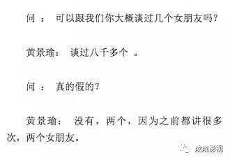去年5月接受采访,被问到谈过几个女朋友时,黄景瑜先是开玩笑说“谈过八千多个”,随后澄清表示只谈过两个:“因为之前都讲很多次,(谈过)两个女朋友。”他表示最长交往时间也有个三年、四年。