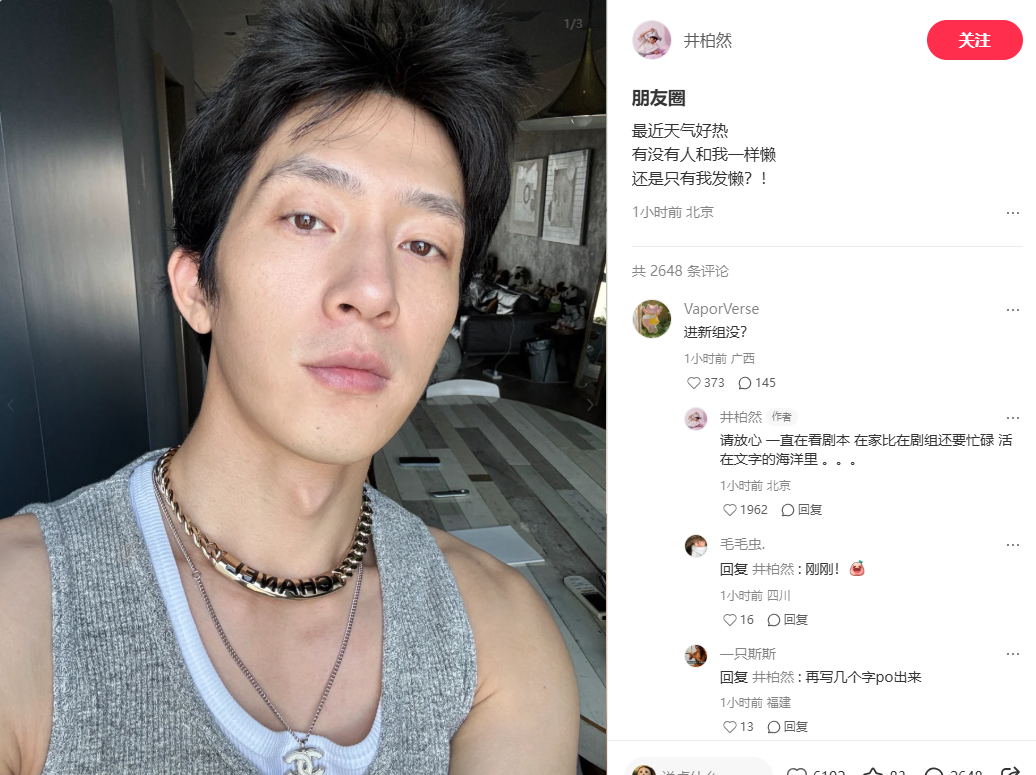 井柏然晒宅家素颜照,自称“中年男子”:一直在看剧本,在家比剧组还忙 钱江晚报 内地男星 2025-06-10 17:06:59 116 创作不易,用心坚持,欢迎请BaGua喝几杯爱心咖啡!打赏并支持本文 打赏并删除本文 近日,井柏然在个人社交媒体晒出宅家素颜照,与网友亲密互动:最近天气好热,有没有人和我一样懒,还是只有我发懒?!照片中,井柏然身着简约的灰色无袖背心,睡眼惺忪,一头蓬松的头发被网友戏称“别致的发型”,不少网友表示,刚睡醒就拍素颜,真没把粉丝当外人,井柏然道:“我这是中年男子的标配了”。井柏然还透露,一直在看剧本,在家比在剧组还要忙碌,活在文字的海洋里。对于网友关心的是否与刘雯“领证”,本人暂时没有回复。公开资料显示,井柏然,1989年4月19日出生于辽宁省沈阳市,男演员、流行乐歌手。其代表作有《捉妖记》《后来的我们》《失孤》等。潮新闻·钱江晚报记者陈颖静综合自@井柏然、网友评论责任编辑:袁颖点赞分享在看 创作不易,用心坚持,欢迎请BaGua喝几杯爱心咖啡!打赏并支持本文 打赏并删除本文 感谢您的支持鼓励,我会继续努力的!文章地址:用户邮箱:打赏金额:USDT 请输入数字点击”去打赏“,即可进行打赏支持本文章哦 井柏然 发表评论