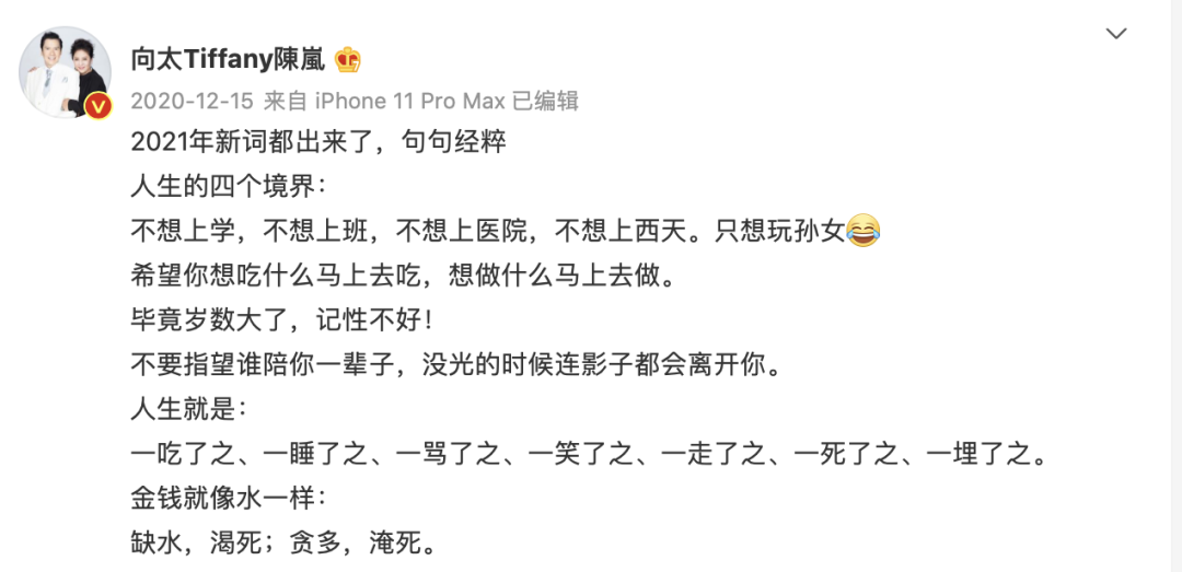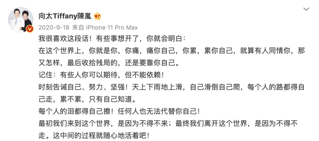 从向太的微博,你能看到类似“当代美文赏析,说得有道理的转”的语句,并且开头一定是“最近被一段话刷屏了”、“这些人生道理,句句经典”。