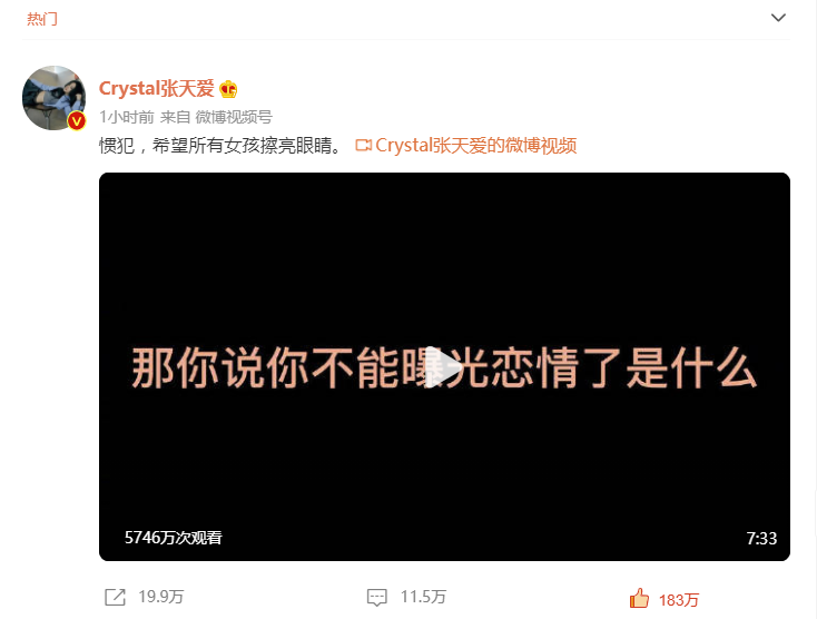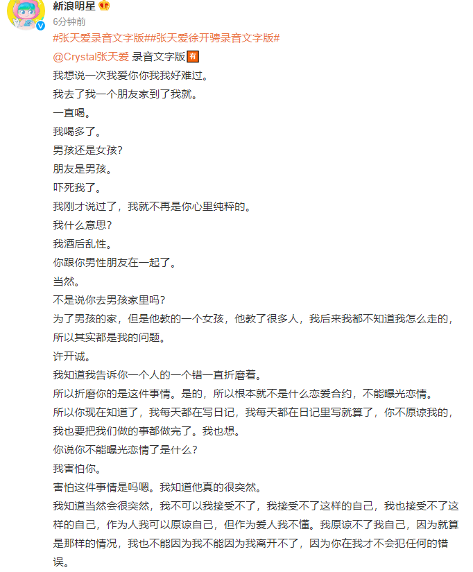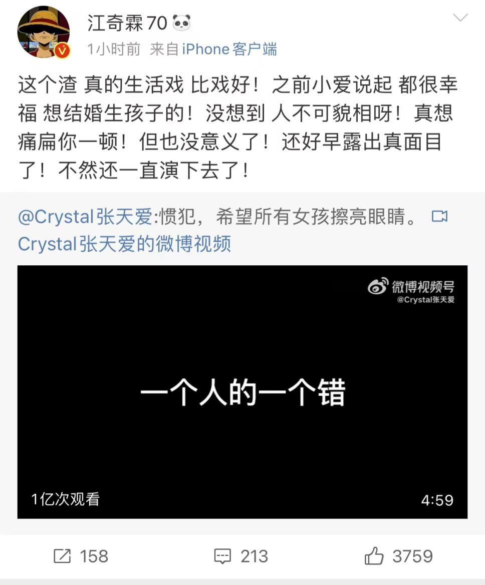 张天爱在微博发布了一条录音视频,并配文:“惯犯,希望所有女孩擦亮眼睛。”