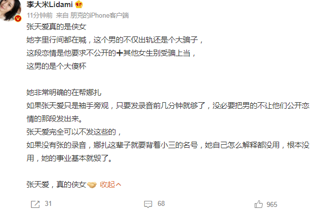 在张天爱曝出视频后不久,沉默许久的古力娜扎也转发了微博,并直接表明:我不是小三。