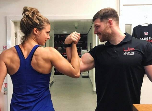 现在,杰玛的健身成果已经显现,正如图中所示,她正与教练“得瑟”自己的健身成果。只是,她对自己某个部位还不是很满意。