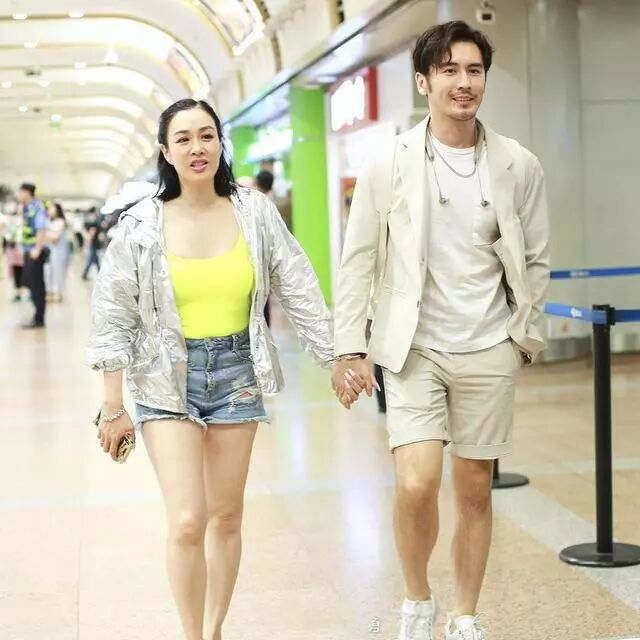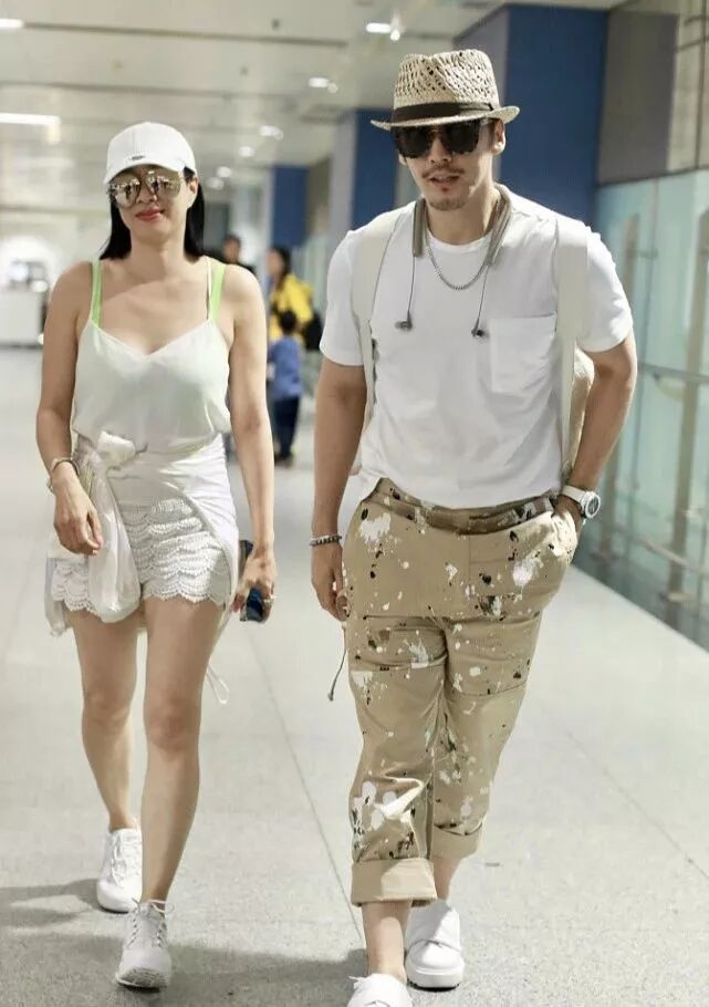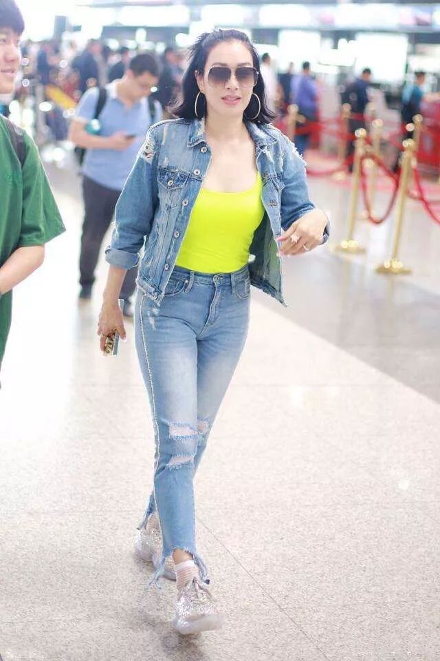 和老公一起出行的钟丽缇穿的很是清凉呢,一件低胸的黄色吊带塞进蓝色牛仔热裤中,大秀性感好身材呢,她的身材不是时下小女生的那种骨感,她的身材很有料,珠圆玉润的,很性感,黄色的吊带很青春呢,外搭一件银色的防晒衣也是很潮流呢,这衣品很潮流呢。