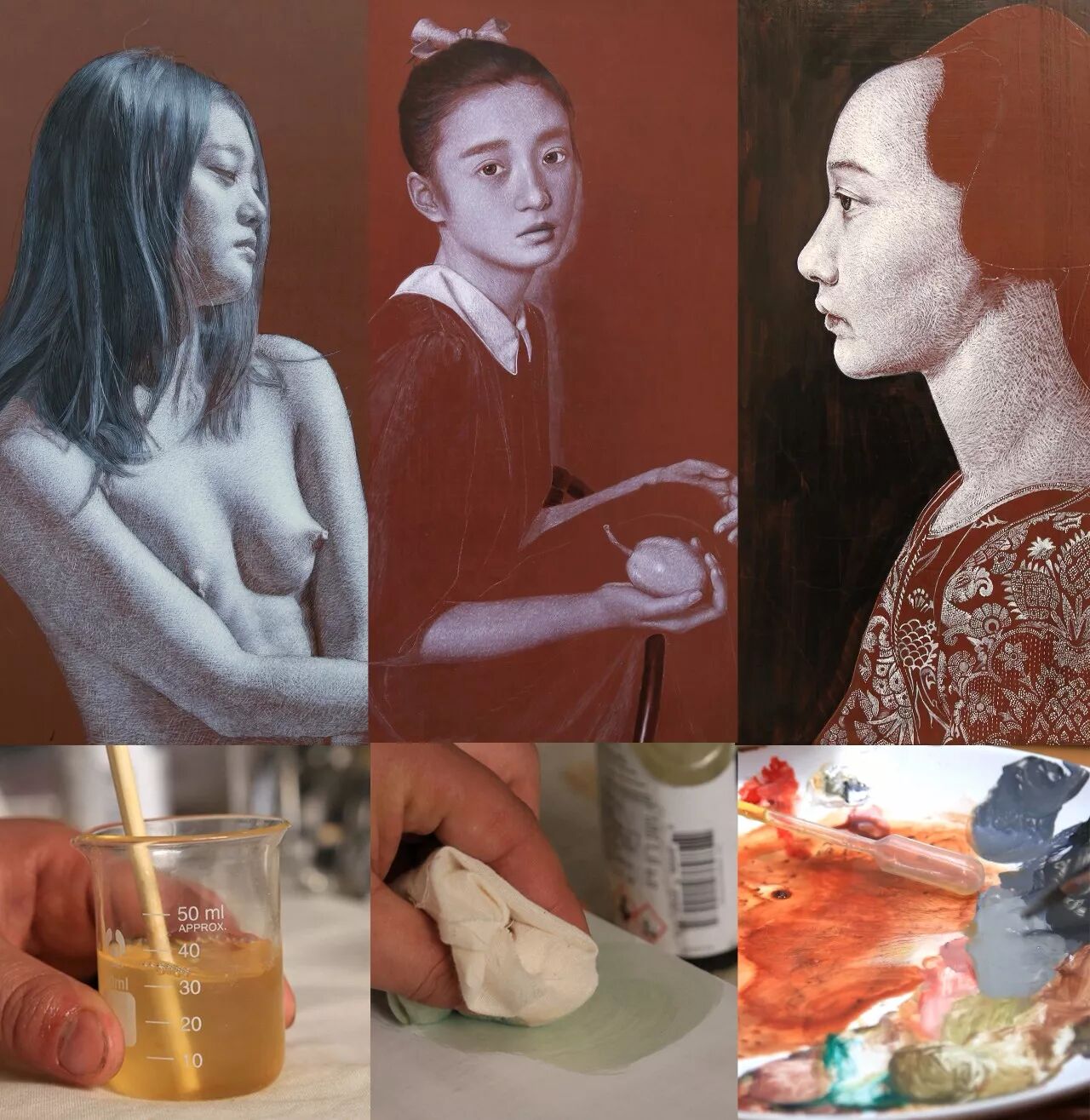 进入中层描绘,用鸡蛋与树脂调配成的乳溶液加坦培拉白,进行线影法提白。提白时一般从最亮部开始,中间部、暗部,依层次推移。最暗部不动,通过提白把形塑造好。然后用调制好的天然树脂油调配颜色开始实施透层(Glazing)上釉法罩染(对下层单色提白后的层上色),趁树脂未干时再次提白。