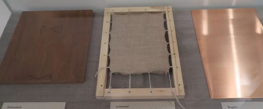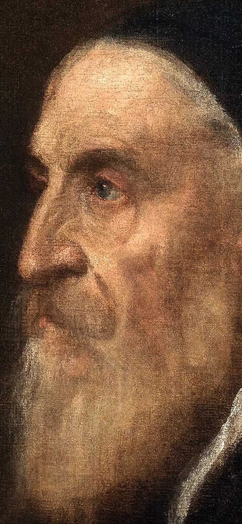 同时用船上的亚麻帆布替代了木板作画,很多大的油画不易用沉重的木板,中粗麻布上作画经济而且便于拆卸携带,提香·韦切利奥的油画多是在画布上画的。如右图,麻布的纹理清晰可见。