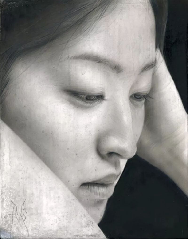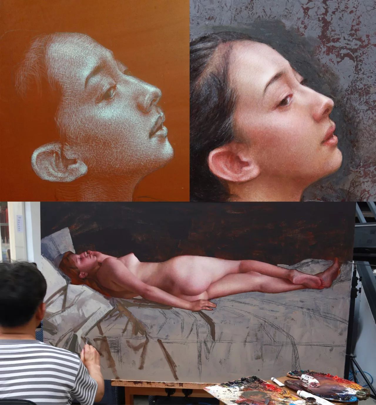 具体地说,是在底涂层的素描稿上面,罩染半透层调子,再随型涂上比较弱的半透明半覆盖色层,中间局部使用干擦的掠层法,并反复实施透明罩染。这样多层的透层与不透层相互折射作用产生的光学灰色层称光学灰的效果。