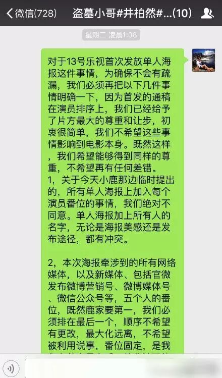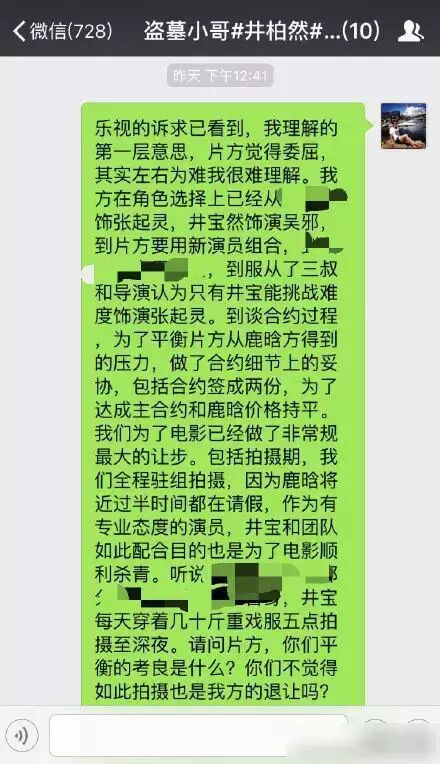 1月14日下午,井柏然经纪人张阿信发布微博称“岂曰无衣?与子同袍。关于盗墓,我们让,不撕。”其微博中提到井柏然方为了这部戏已经作了很大的让步,最初在角色选择上,因为片方要用新的演员组合,井柏然已经从吴邪让步到张起灵。而在拍摄时,鹿晗将近过半的时间都在请假,但井柏然作为有专业态度的演员,全程驻组,每天穿着几十斤重的戏服从5点拍摄至深夜。