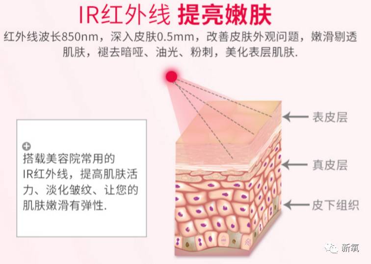 红外线波长850nm,可以深入表皮层,约在皮下0.5mm位置。根据红外线的作用原理,这一功能可以有效的改善肌肤的新陈代谢功能,淡化色沉。