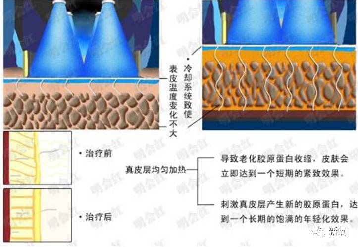 因此它对真皮层有非常精准的针对性作用,真皮受热胶原纤维就会收缩(做完即刻有紧致效果就是这原理)。温度再高一点,受热部位的胶原蛋白就会凝固,这种损伤就可以激发皮肤的自我修复机制,最终实现胶原蛋白的再生,达到更持久的紧致肌肤的目的。(坚持使用的话就是一边让胶原纤维收缩,一边增生新的胶原,正循环起来)