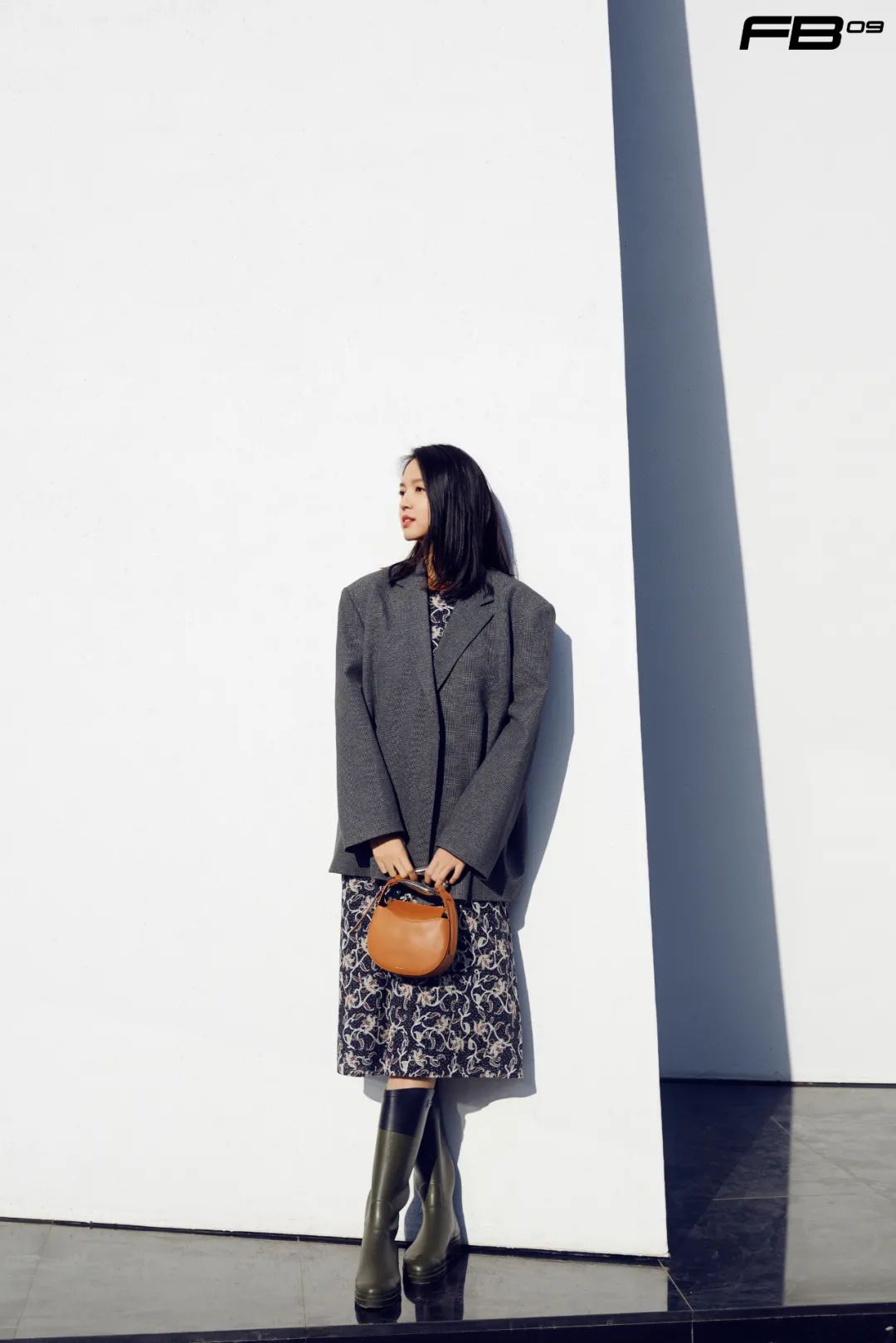 △黑灰色廓形西装带来浓郁复古感,搭配印花长裙,亦正式亦休闲