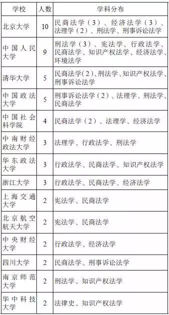 清华大学有5位,其中民商法学有2位。中国政法大学也有5位,其中刑事诉讼法学有2位。中国社会科学院法学研究所有4位,其中民商法学有2位。中南财经政法大学、华东政法大学和浙江大学各有3位。上海交通大学、北京航空航天大学、中央财经大学、四川大学、南京师范大学、华中科技大学各有2位。