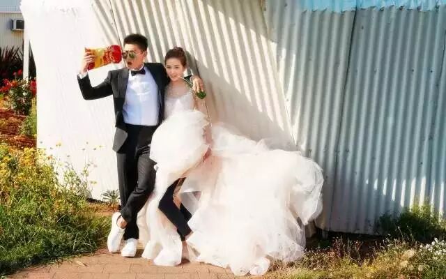 吴奇隆刘诗诗的婚纱照都不介意露出婚纱底下的保暖裤了,要的就是随意自然的feel吧!