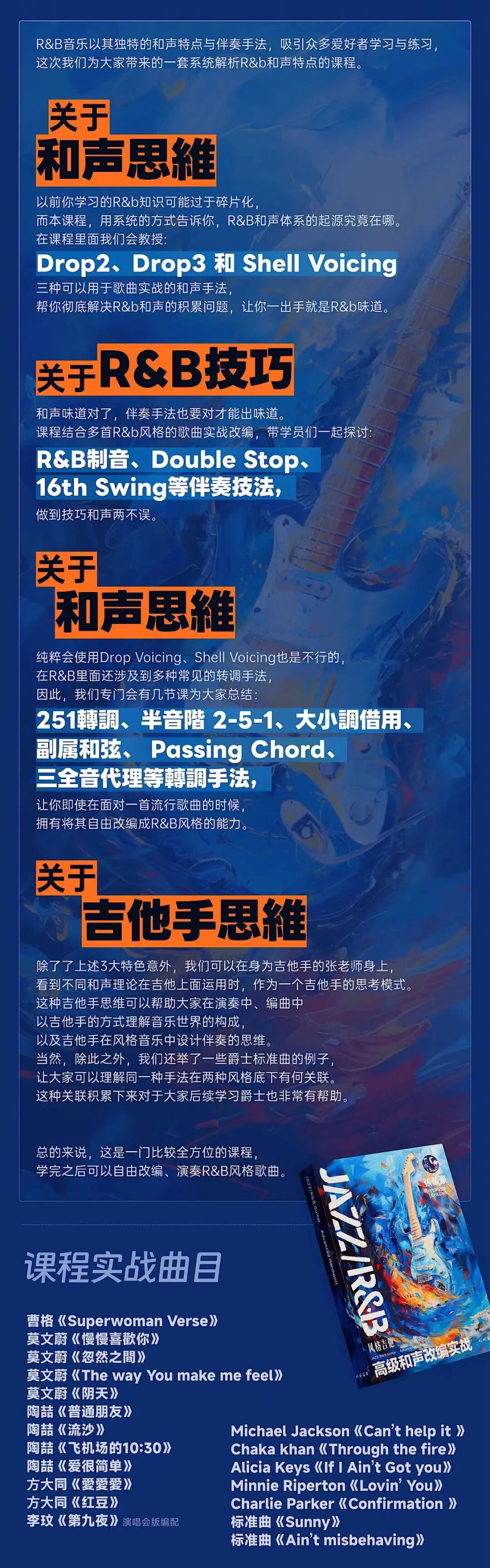 莫文蔚巡演音乐总监大佬带你玩吉他RNB?这很难学不会了吧! 哎呀音乐 港台女星 2025-07-02 18:12:48 80 创作不易,用心坚持,欢迎请BaGua喝几杯爱心咖啡!打赏并支持本文 打赏并删除本文 什么是R&B?其实很多人都不是很清楚这具体是个啥。专业的介绍里,它是:节奏蓝调Rhythm And Blues,简称 R&B 或 RnB,是一种美国非裔艺术家首先采用,并融合了爵士乐、福音音乐和蓝调音乐的音乐形式。然而我们现在通常说的R&B,早就已经是另一种东西了。它是由 Disco 逐步变得不那么流行而发展出来的当代节奏蓝调──一种现代灵魂乐和受放克音乐影响的流行音乐。可以粗浅地认为,当代 R&B 就是 80 年代以后的一种黑人音乐主导的流行音乐,可以把 Soul、Funk、Pop、Hip Hop 甚至电子都融入进来的一种“框架式”音乐。说到RNB我们国内听众的启蒙,必然是方大同,陶喆,王力宏等人,24年方大同生前推出的全新专辑《梦想家》,里面有一首先行主打曲目《才二十三》是小编的最爱。这首曲目的和弦写得很美,把对时光流逝的不舍感,描写得很温柔。但这首曲子随手截图和弦都是吉他入门选手看着有点晕乎的。那这首RNB到底用了什么和声,还有对应的编配技巧呢?香港著名演奏家张骏豪老师来跟大家浅浅地分析一波:RNB的和声运用比流行板块还是高阶一点,了解到广大吉他手们的需求,我们邀请了给莫文蔚做巡演音乐总监级别的大佬,张骏豪老师设计了这一门从【和声思维】【RNB技巧】【实战曲目】相结合的课程,带大家系统学透【RNB和声】,并用多首经典曲目举例,其中就包括陶喆和方大同等人的RNB金曲。张老师有丰富的实战演出经验,是众多知名歌手的指定乐手,也做过不少演唱会的音乐总监。这套课程是老师根据自己的演出和教学经验所总结出的精华内容~这套课的练习量巨大,设计实战曲目有大家熟悉的PPT教父的经典曲目,目前是张老师亲自上阵辅导,根本不怕学不会!原价499,文章专属优惠仅需199拿下已购同学或者对这本课程有疑问的同学都可以扫码添加班主任老师咨询噢!编辑:布鸡?哎呀音乐招募内容及商务合作后台回复「投稿」/「合作」查看详情商务合作:xiaoshenjshizi务必备注来意 创作不易,用心坚持,欢迎请BaGua喝几杯爱心咖啡!打赏并支持本文 打赏并删除本文 感谢您的支持鼓励,我会继续努力的!文章地址:用户邮箱:打赏金额:USDT 请输入数字点击”去打赏“,即可进行打赏支持本文章哦 莫文蔚 发表评论