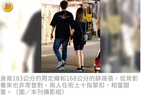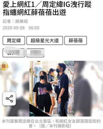 9月8日,有台媒报道称,歌手周定纬疑似恋情曝光,深夜与一网红女十指紧扣外出逛街,两人互动亲密宛如热恋。