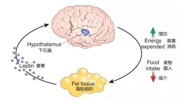 当我们因进食过多脂肪增加时,瘦素就会刺激下丘脑的感受器,通过交感神经将“别吃啦”的信号传递到摄食中枢,从而降低食欲。