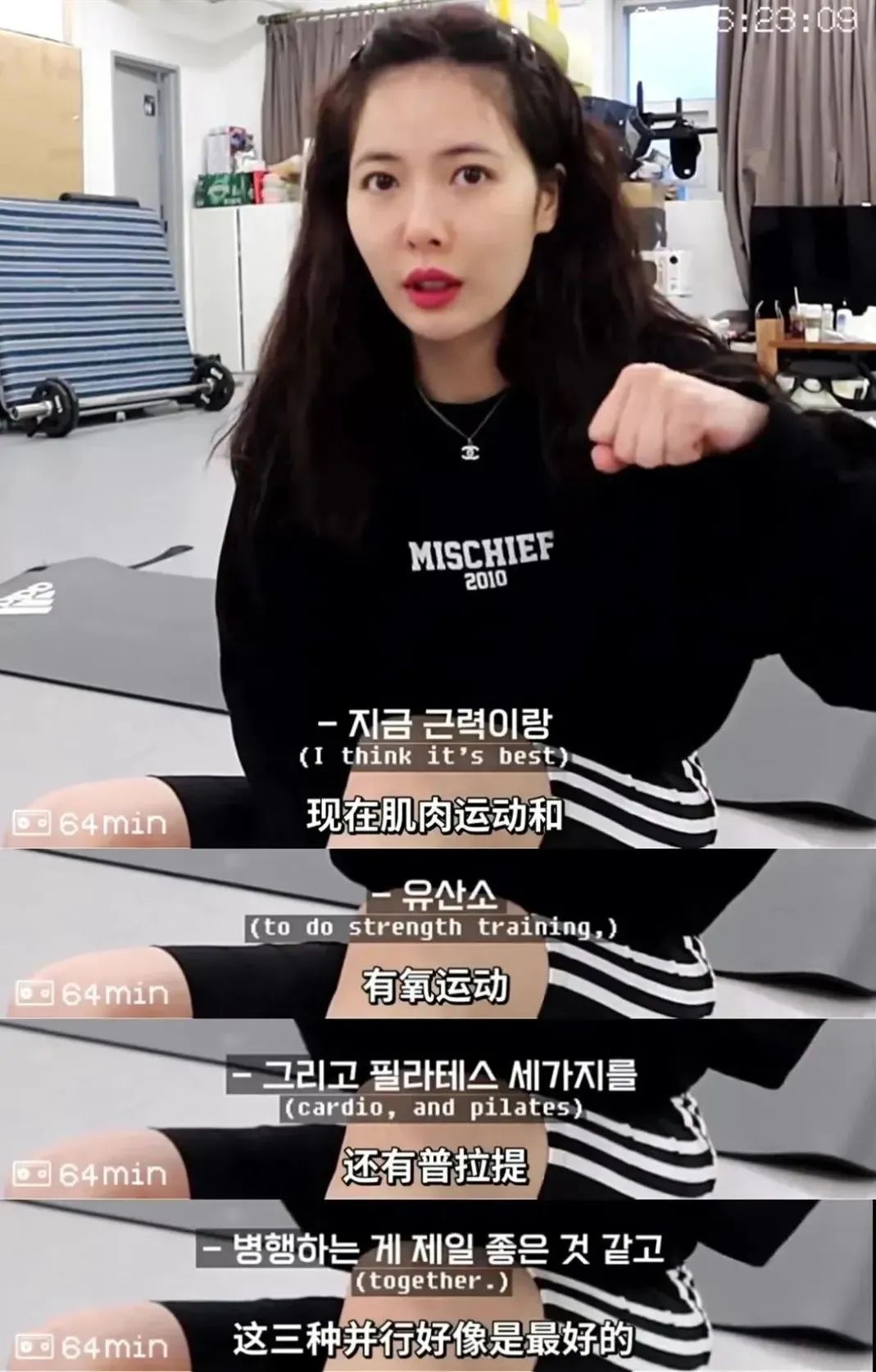 泫雅之前在自己关于减肥&健身的vlog里就提到了她多年来的运动经验,她表示将锻炼肌肉的力量训练、有氧运动和普拉提结合进行才是最有效的方法。