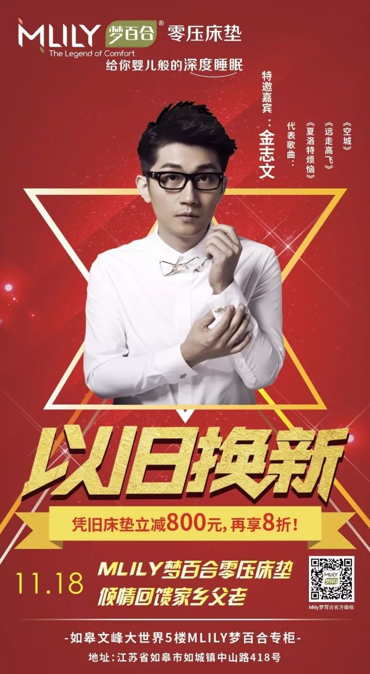 现在,你也可以亲耳听见金志文独特的声音啦~11月18日,Mlily梦百合约“惠”金志文,邀你于江苏如皋共赏一场“金氏”音乐会,体验由零压床垫带来的深度睡眠。