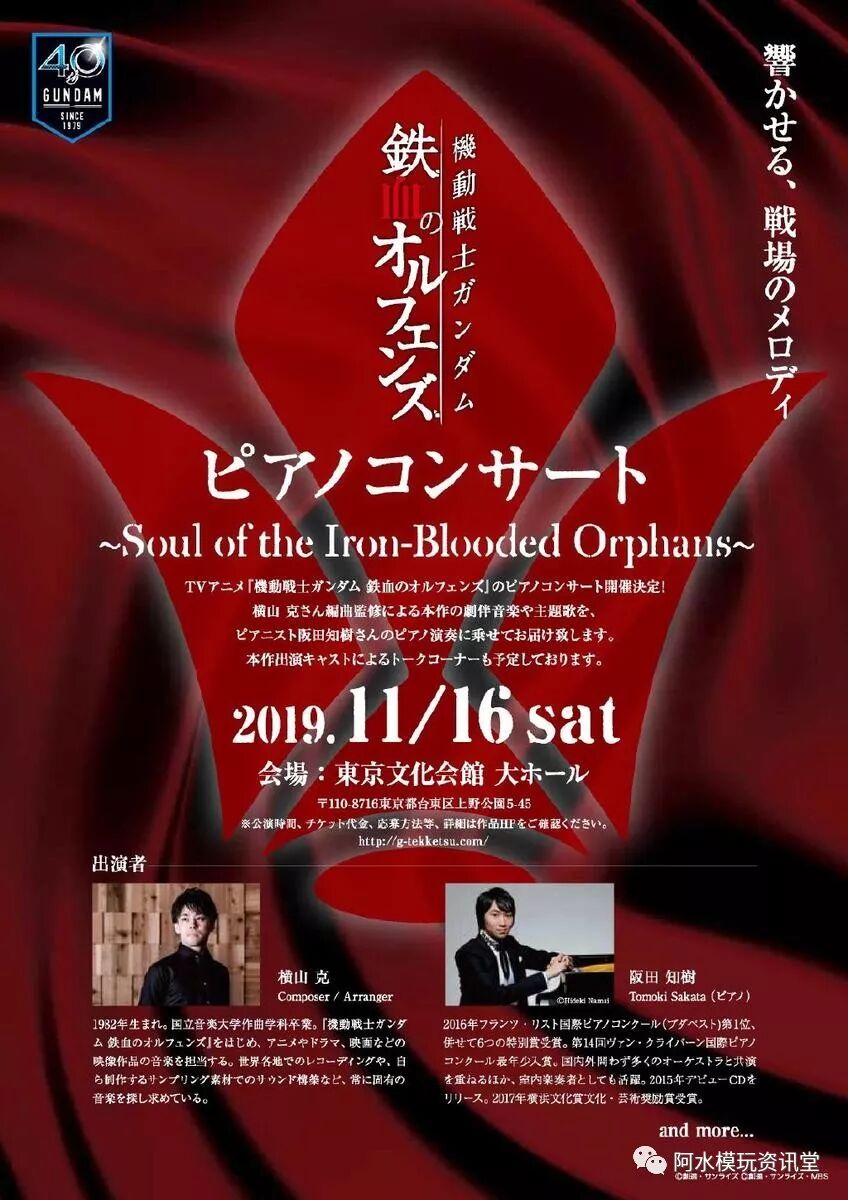 将于11月16日在东京文化会馆大音乐厅(東京都台東区上野公園5-45)举办,两场(日场14时开始、夜场18时开始,皆当地时间)。曲目为横山克编曲监修的BGM和主题歌,由钢琴演奏家阪田知树演奏。预定还有铁血出演CAST的Talk环节。Gundam Fan Club今天傍晚起开始先行订票,票价6600日元(含税)