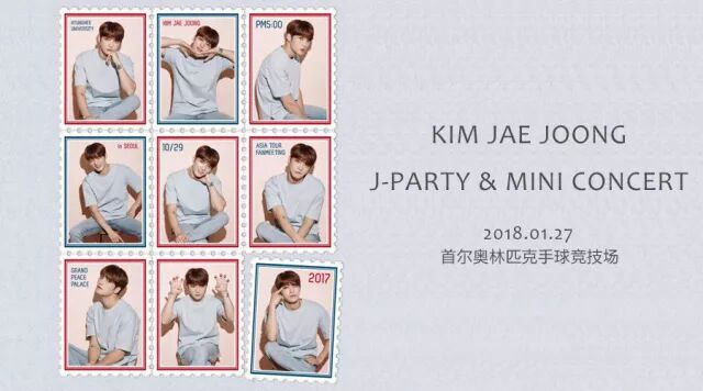 在中将在2018年1月26日迎来自己的32岁生日,为了庆生他将于1月27日在奥林匹克公园SK奥运手球竞技场举行生日粉丝见面会《2018 KIM JAE JOONG J-PARTY & MINI CONCERT》。