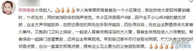 郑爽爸爸参与火灾救援的举动被邻居们纷纷点赞。网友表示“好人会有好报”“为郑爽爸爸点赞”“正能量爽爸”。