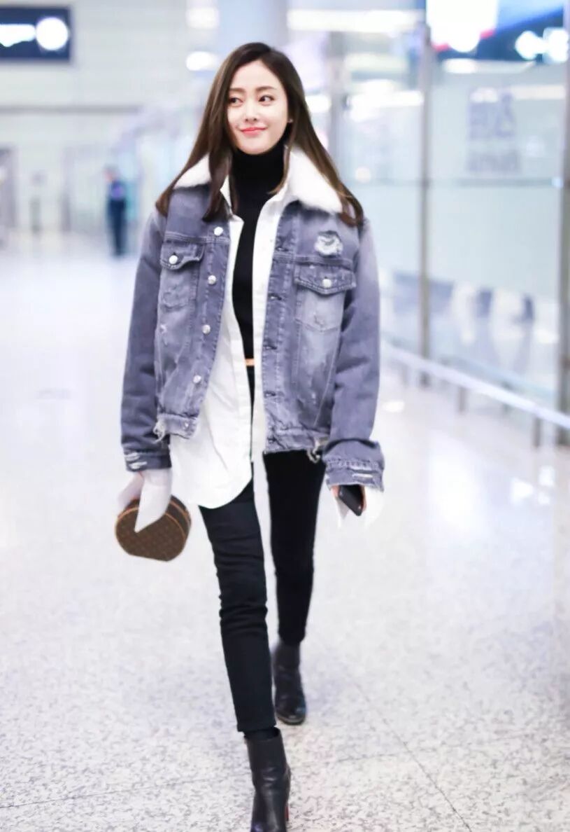 蓝色牛仔上衣,十分接地气,由于自己苗条的身材,让网友十分羡慕,张天爱一条黑色紧身裤子,这麻杆腿也是没谁了。