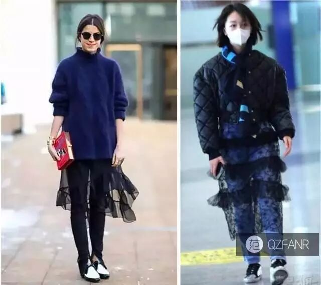 把蕾丝穿得清新得体的周冬雨也有失手的时候,右图什么鬼?宽松牛仔裤外穿蕾丝裙?这样随性的混搭,咱不跟哈。