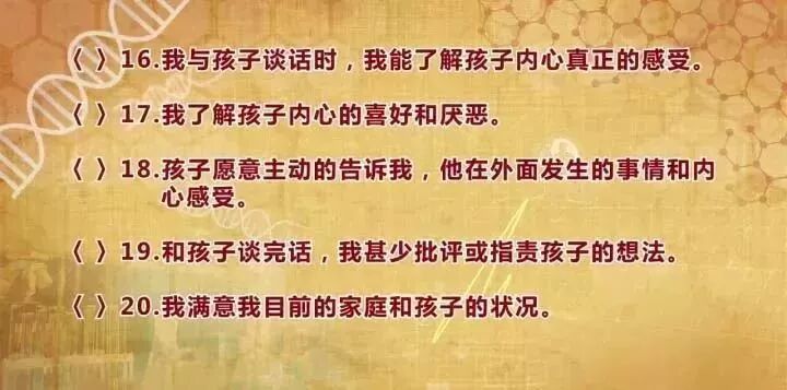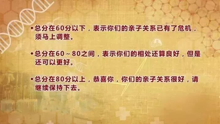 家长们可以根据自己的得分情况,查看自己亲子关系的融洽程度,得分越高,代表亲子关系越好。