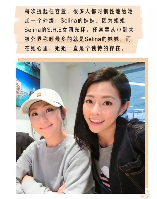 任容萱和Selina相差7岁,她曾经说,任爸任妈怕姐姐孤单,所以就有了她这个妹妹。容容念书的时候S.H.E就很火了,身边很多人都会唱她们的歌,那时候任容萱会开心地和别人介绍:“她是我姐姐,成绩好,还很会唱歌”,对任容萱来说,姐姐不仅是她的家人,也是她从小到大的偶像。