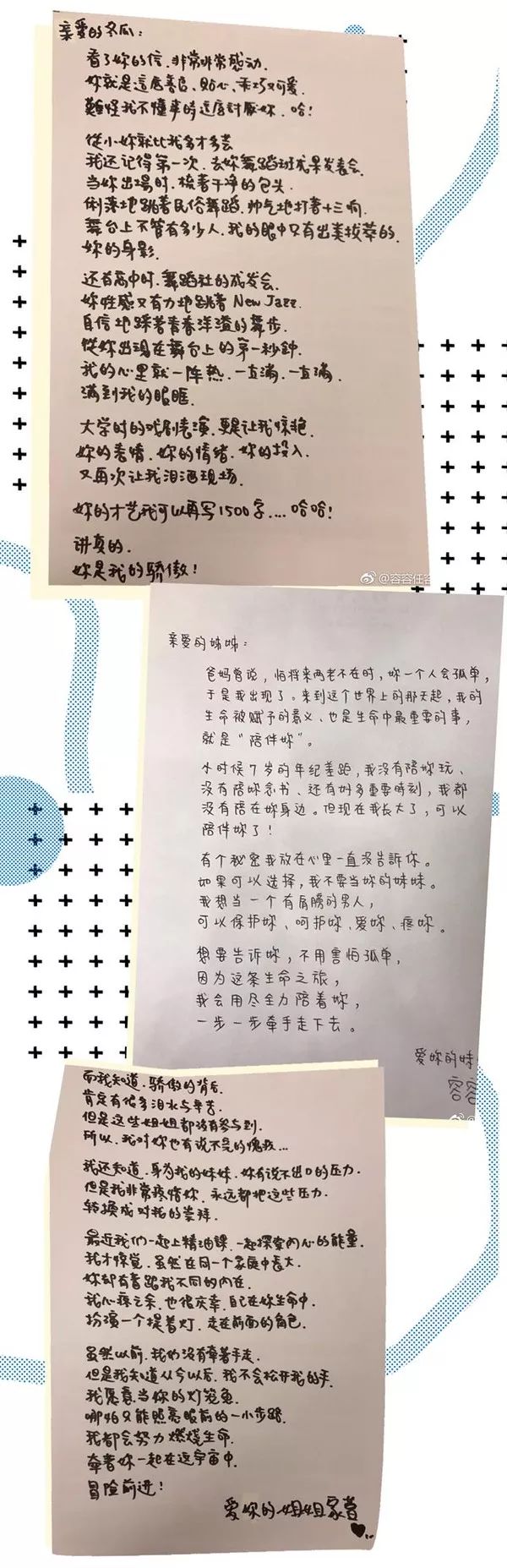 在外面说起姐姐时,任容萱脸上的笑容自然又真实,她让这份姐妹情变的更珍贵。在《王牌对王牌》的写信环节中,任容萱给姐姐写了一封信:“如果可以选择,我不要当你的妹妹,我想当一个有肩膀的男人,可以保护你,告诉你不用害怕孤单,我会用尽全力陪着你,一步一步牵手走下去”。