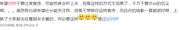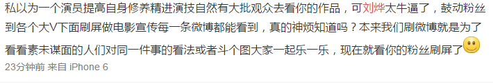 但为什么一听说要搞单人票房排行榜这种事情会引起这么大的众怒,连粉丝都炸了?逼的郭敬明连发三条微博澄清?因为这是绑架。这是在溜粉。这是在逼我一个穷苦爱豆粉为了爱豆砸人民币加入战争啊!刘烨这一次的宣传也是。只不过他绑架的不是粉丝的钱包,他绑架的是所有网民的眼睛。这很招黑啊,但没什么宣传经验的刘烨不太懂。