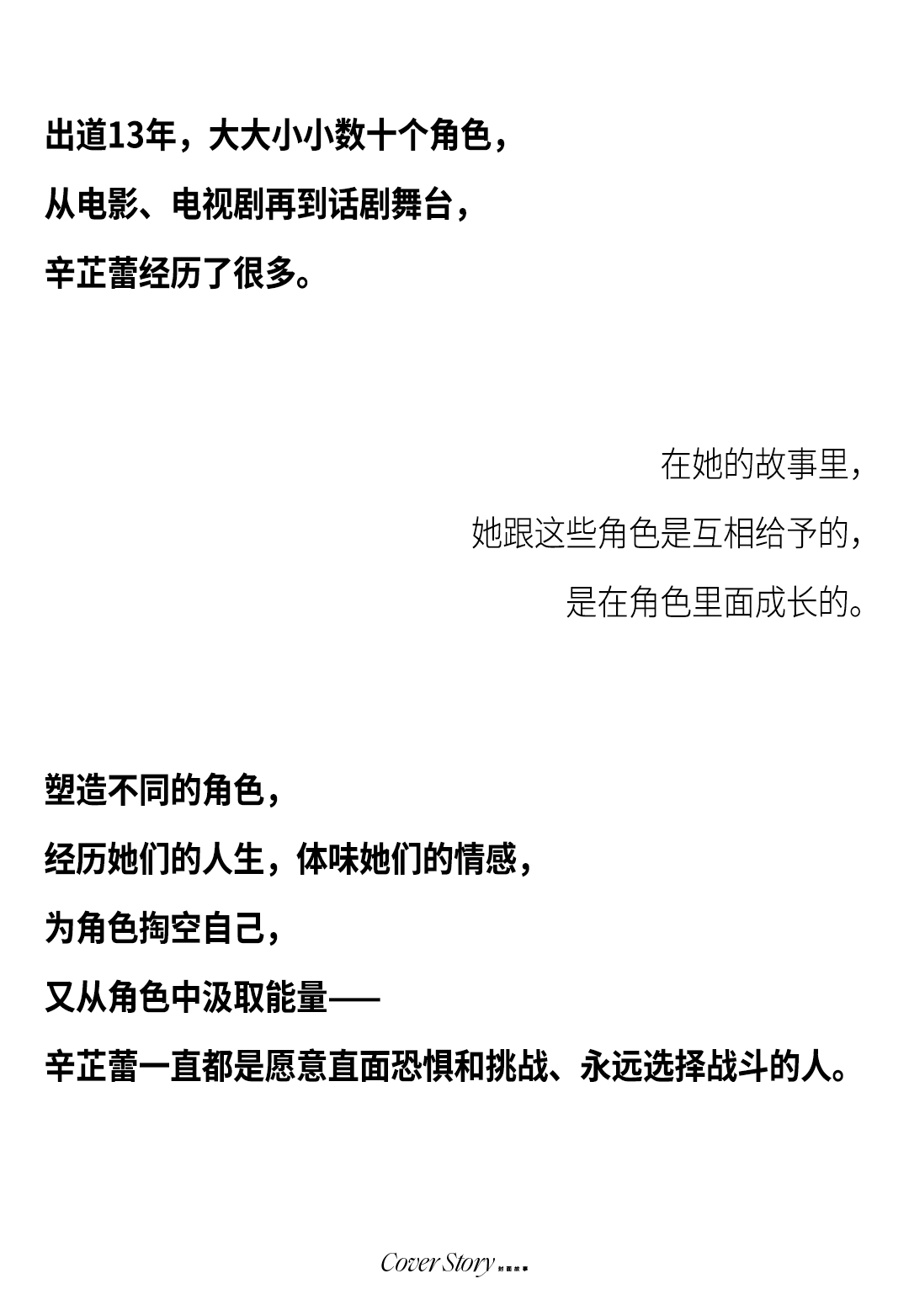 “我跟这些角色是互相给予的,是在角色里面成长的。当你觉得演戏没有挑战的时候,就会想要更难的角色来丰满自己。”塑造不同的角色,经历她们的人生,体味她们的情感,这是辛芷蕾获得感悟与成长的方式。在通过学习慢慢贴近角色的时候,也贴近了那些原本跟自己的生活相隔甚远的人。
