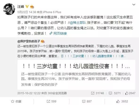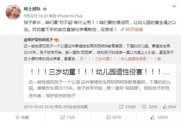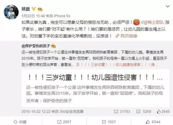 对此,章子怡在微博转发了此事件新闻微博,刚刚荣升母亲的章子怡看到孩子受到了伤害,忍不住发文声讨:“孩子家长,咱们要“对不起”有什么用?!咱们要的是惩罚,让幼儿园的畜生绳之以法。对幼童下手的变态直接化学阉割他,没废话!”