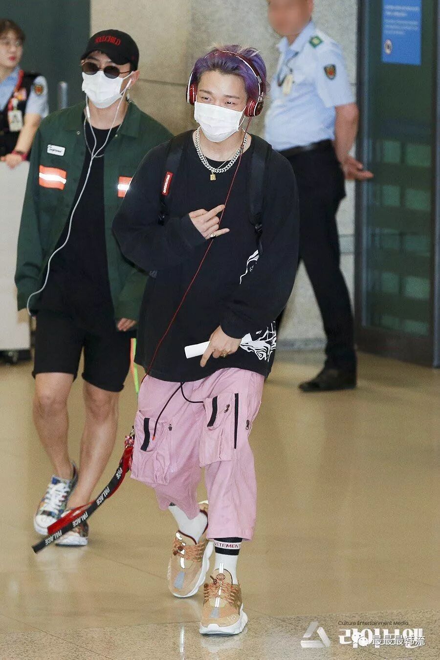 最不怕的就是rapper走机场!因为拉风!黑色印花卫衣搭配粉色掉裆短裤黄色运动鞋在加上一头紫发,你说带不带感!