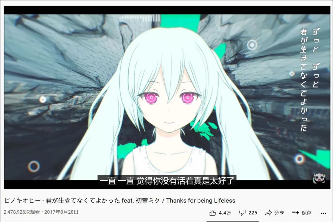 就像初音十周年纪念的时候,ピノキオピー(匹诺曹P)写过的一首歌,叫《君が生きてなくてよかった》,意思是“你没有活着真是太好了” 。