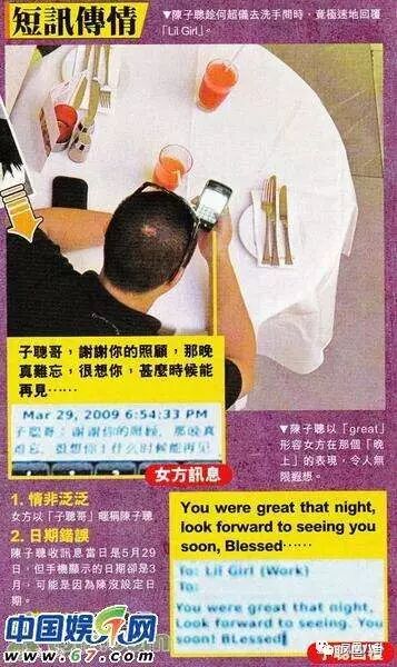 香港媒体报道援引知情人透露:陈子聪与太太在香港的太古广场喝下午茶时,陈子聪趁着太太离开之际,悄悄与一位神秘女郎用短信相互传情,此事件被何超仪发现后雷霆震怒!
