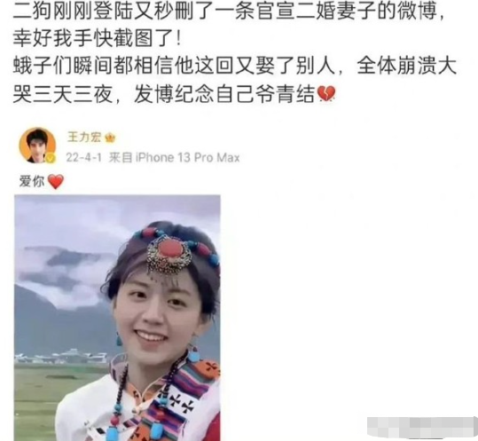 有网民更发现他在本月初,疑似在社交网上载张新相,而相中是一名「美女」的大头照,还写着「爱你」两个字,由于这个发文惹来了「示爱」的揣测,好关心他的网民又立即起哄齐齐疯狂讨论,差点都要开埋盘口,不知道已经恢复单身的王力宏是不是要官方宣布新恋情,还是要直接公开二婚的太太?但未等到王力宏亲自进行回应,这个文章被秒删了,没有再进行转发。