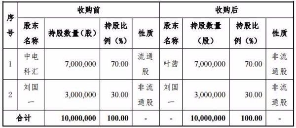 据收购报告书显示,叶一茜以700万元,收购中电科汇持有的科电瑞通700万股,占公司总股本的70%,收购完成后,叶茜将成为公司的实控人。