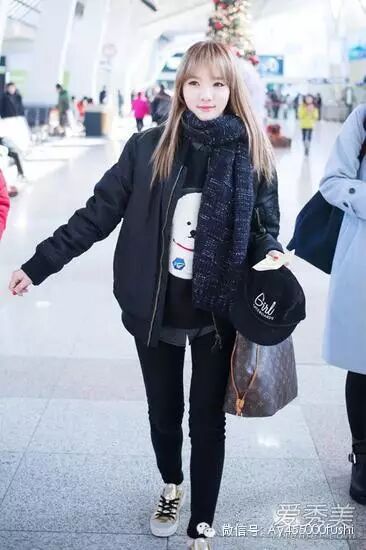 Stellar成员敏希穿黑色飞行员外套配卡通毛衣和黑色紧身裤,帅气不失可爱,和欧美人穿飞行员外套比起来,完全就是两种味道。敏希虽然少了帅气和气场,却多了少女的可爱与俏皮,也是蛮讨人喜欢的。