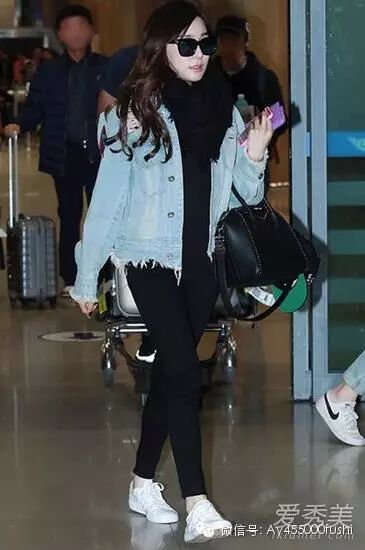再看看少女时代各成员的表现。Tiffany黄美英最新机场造型,用浅蓝色牛仔外套配黑色针织衫和黑色九分裤、小白鞋,简单大方的搭配人人都可以穿。
