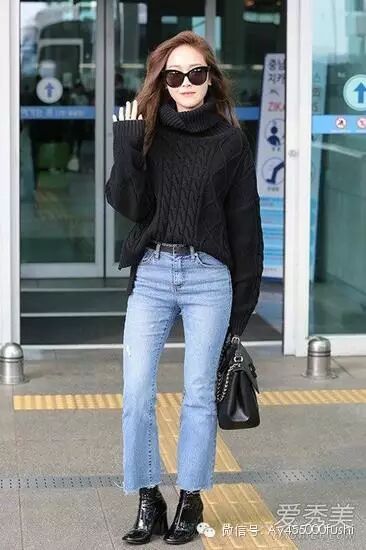 郑氏姐妹最近有点忙,姐姐郑秀妍启程前往巴黎时装周看秀了。黑色高领毛衣宽松范儿,搭配九分微喇牛仔裤和黑色靴子,简单大方的look,却也不失气场。