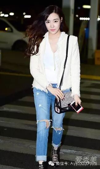 黄美英用白色小外套配白色低胸T恤清新淑女,破洞牛仔裤和绑带高跟鞋增添帅气潇洒的味道。