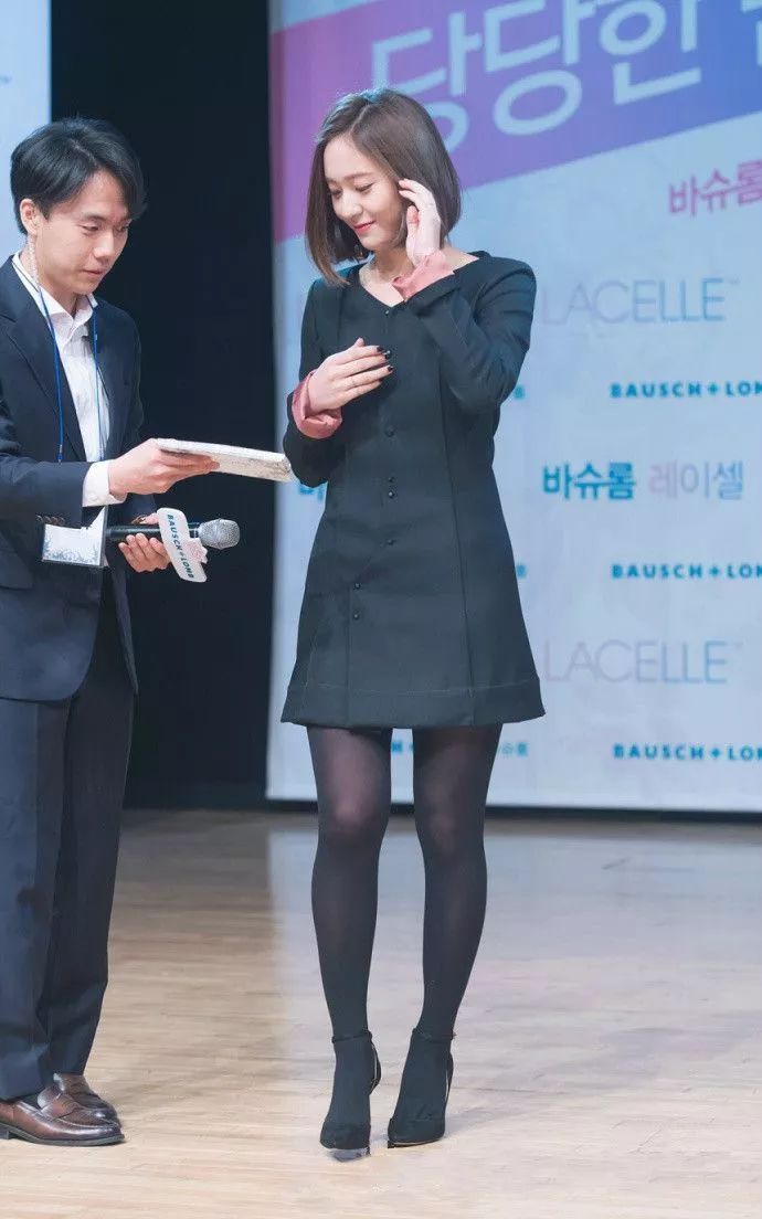 黑色修身连衣裙,也隐藏不住郑秀晶发福的体重。圆领的设计,本身就是凸显大圆脸,还好郑秀晶的脸小,可以hold住自己。