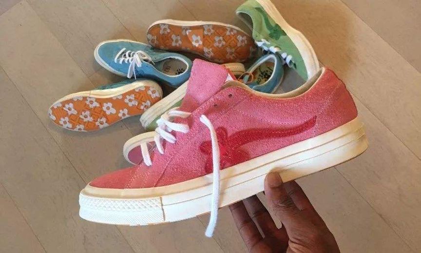 今年Converse和 Golf lefleur的联名也在球鞋圈里火了一把,Golf le fleur的设计师兼主理人Tyler the Creator是一名鬼才嘻哈音乐人,他有趣而又带点恶俗的个人特色无法掩盖他丰富的才华,他的音乐充斥着阴沉的能量,对社会的讽刺和抨击让人对他又爱又恨。他擅长在街头风格的服装上加上意想不到地颜色搭配,他设计的鞋子也延续了他温柔的属性,和他的音乐截然不同。