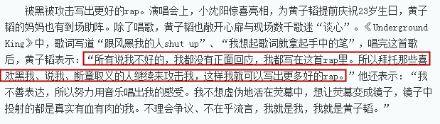 韬韬自己还说:“所有说我不好的,我都没有正面回应,我都写在这首rap里。所以拜托那些喜欢黑我、说我断章取义的人继续来攻击我,这样我就可以写出更多好的rap。”