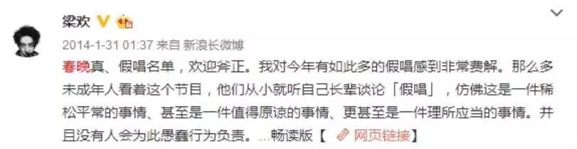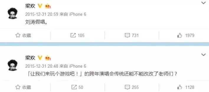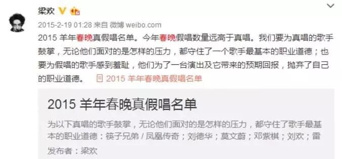 2014和2015,梁欢连续两年在央视春晚结束后发表假唱名单↓
