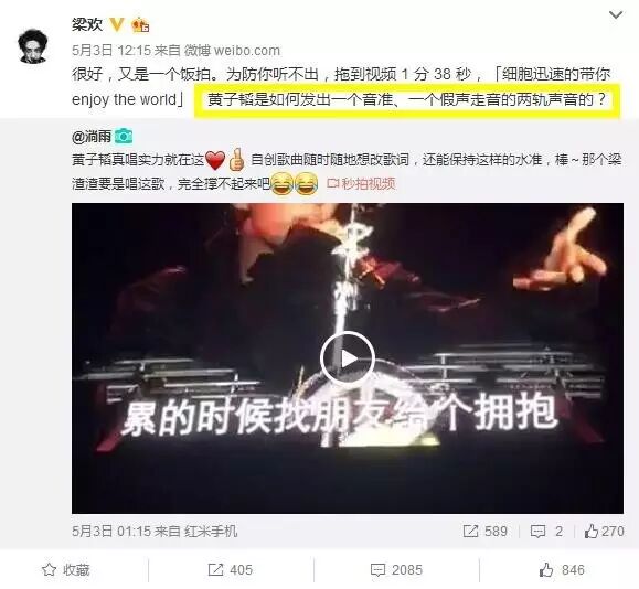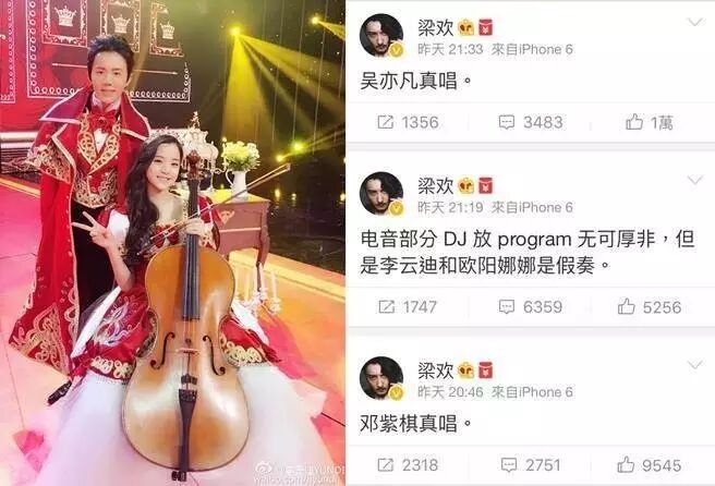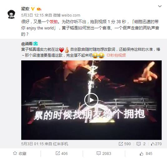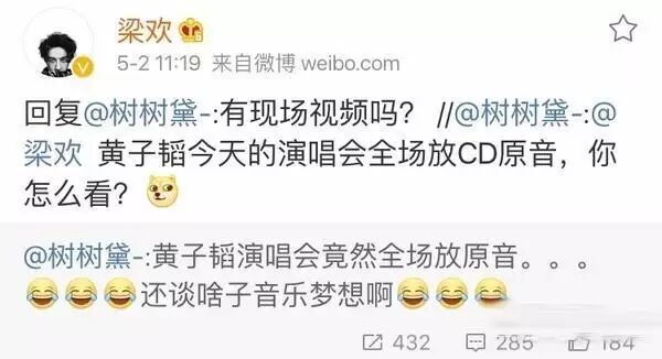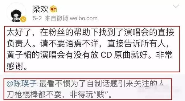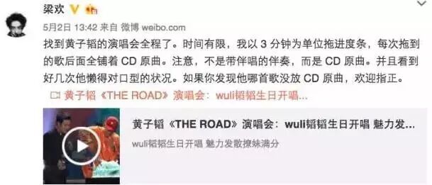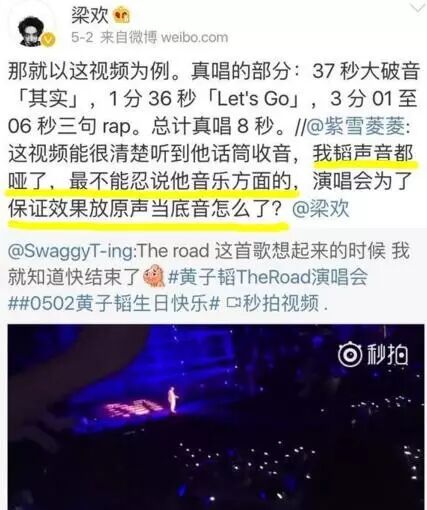 演唱会结束后第二天也就是黄子韬生日那天,著名音乐人梁欢就转发了网友质疑韬韬假唱的微博。